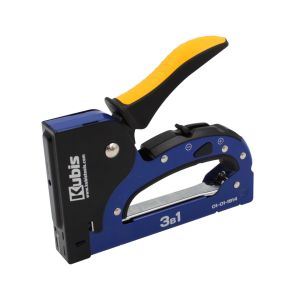 Степлер для скоб і шпильок 3-В-1 з витратним матеріалом в скоби/цвяхи/шпильки. Особливістю степлера є прогумоване руків'я для зручного користування. Ручка степлера зроблена з металу і покрита гумою. Степлер призначений для використання зі скобами висотою від 6 до 14 мм. Ідеальний варіант для скріплення паперу, картону, тканини та інших матеріалів.