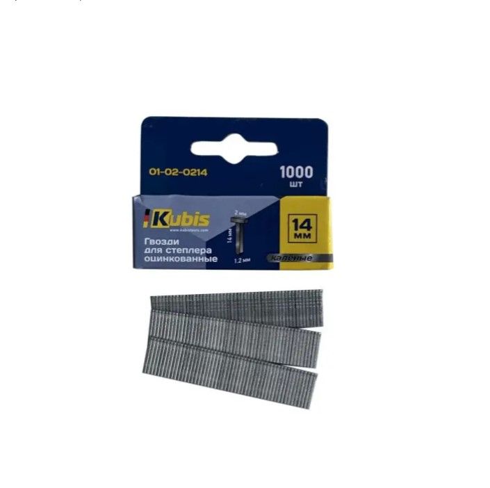 Цвяхи для степлера загартовані 14 мм, оцинковані, 1000 шт. Тип цвяха: без головки. Ширина: 1,2 мм. Колір: сірий. Призначення: тканина, картон, тонкі дерев'яні планки. Кількість в упаковці/Вага: 1000 шт. Тип обойми: касета.