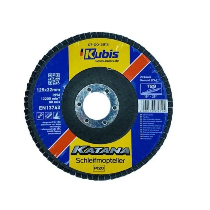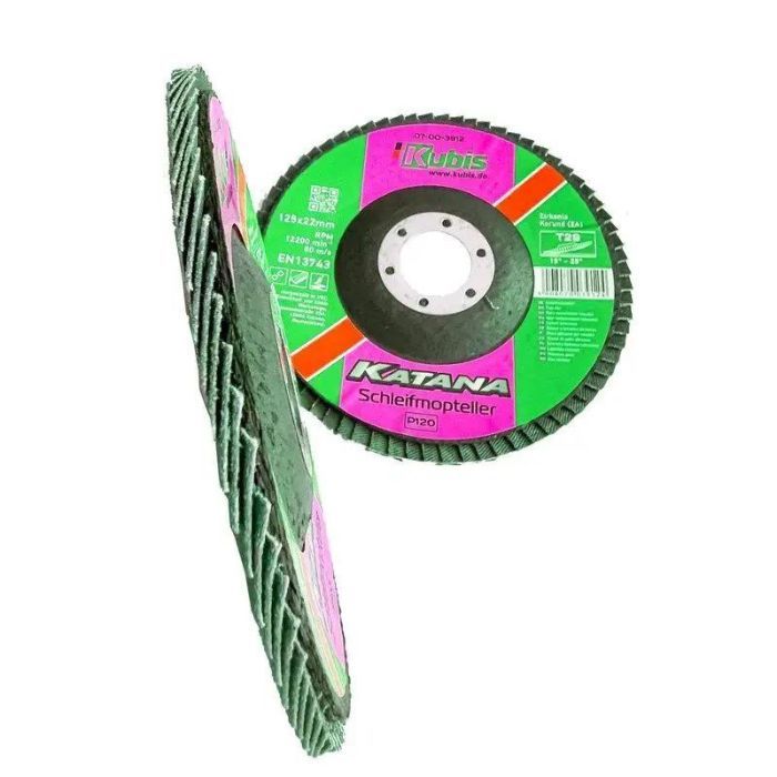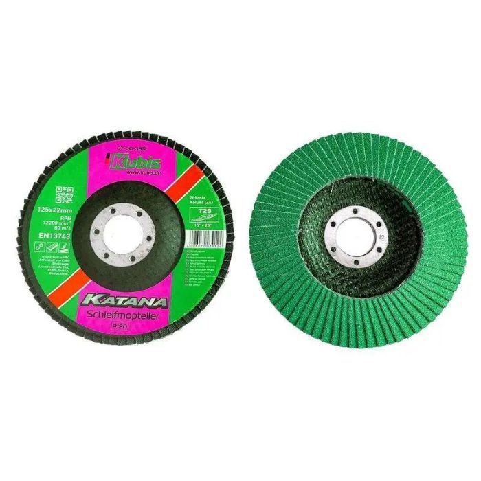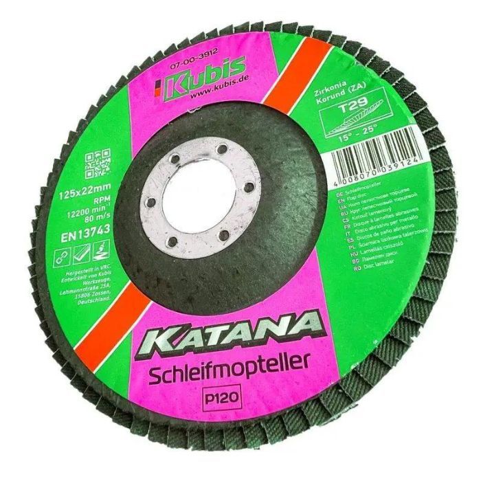 Додаткові переваги Круга пелюсткового торцового конусного Т29 Р120, 125*22 мм, Zirconia KATANA:- Високі швидкість та продуктивність роботи- Збереження форми під час роботи- Мінімальне вібраційне навантаження- Легкість у використанні- Можливість роботи утруднених областях