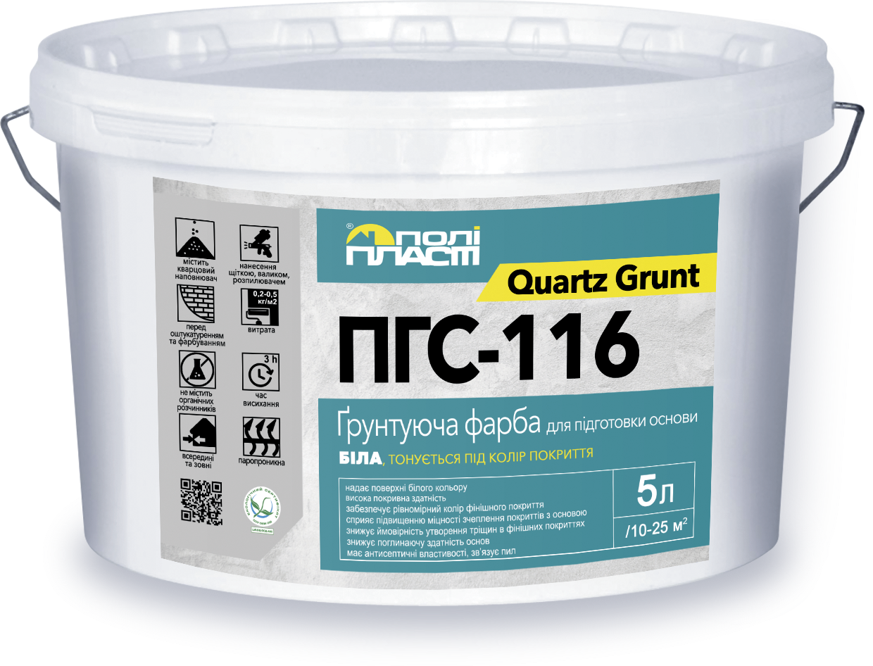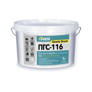 Ґрунтуюча фарба ПГС-116 QUARTZ GRUNT призначена для попередньої обробки водопоглинаючих мінеральних основ всередині і зовні будівель з метою зниження і вирівнювання їх поглинаючої здатності, створення адгезійного шару перед нанесенням полімерних та мінеральних декоративних штукатурок (цементно-вапняних, цементно-піщаних, гіпсових, акрилових, силіконових, мозаїчних тощо) та фарб. Забезпечує рівномірний колір фінішного покриття. Рекомендована для нанесення на захисно-армуючі шари в системах утеплення фасадів та при консервації фасадів на зимовий період. Підвищує адгезію оздоблювальних матеріалів до бетону, цегли, гіпсокартону, ДСП, ДВП, OSB-поверхні, цементно-піщаних, цементно – вапняних штукатурок тощо. Проґрунтована основа має вигляд білої шорсткої поверхні. За необхідності тонується під колір покриття.