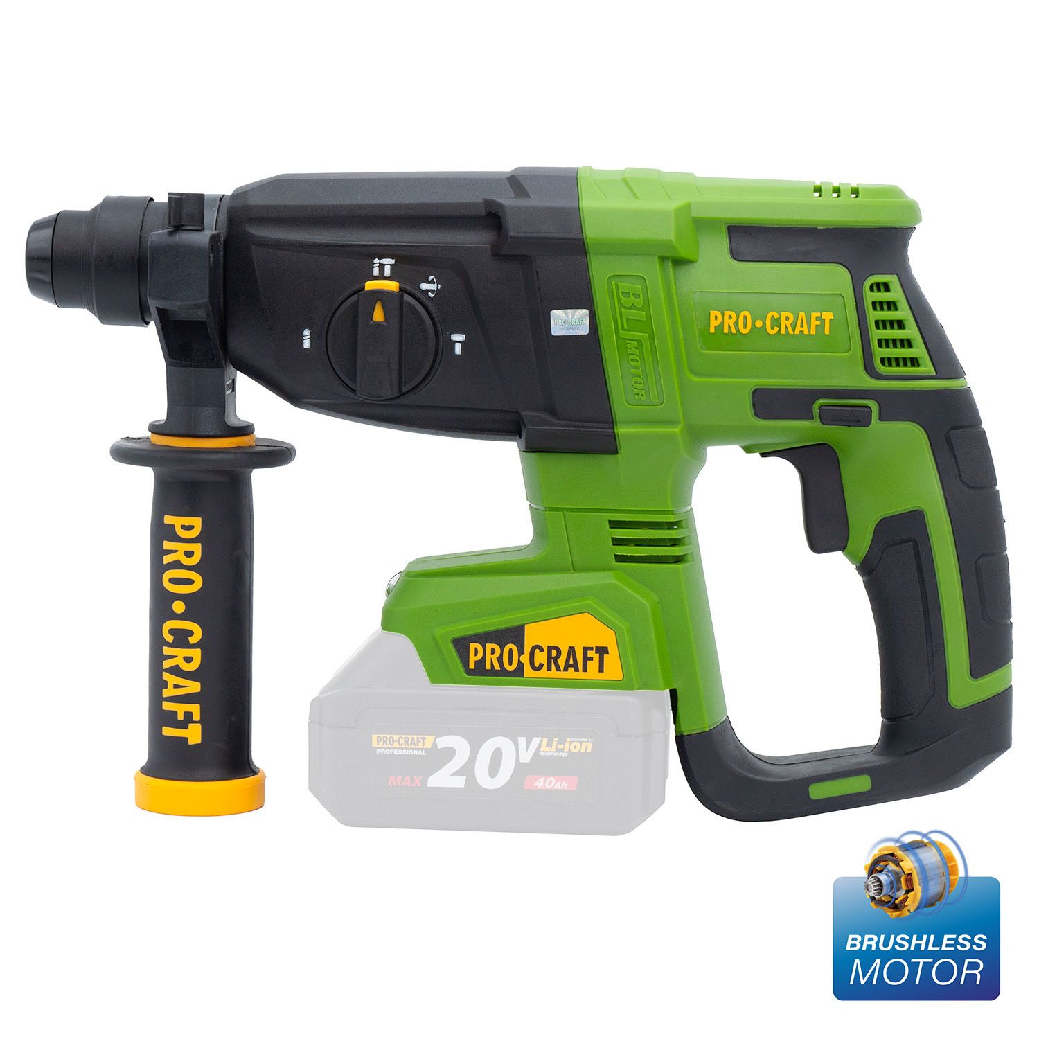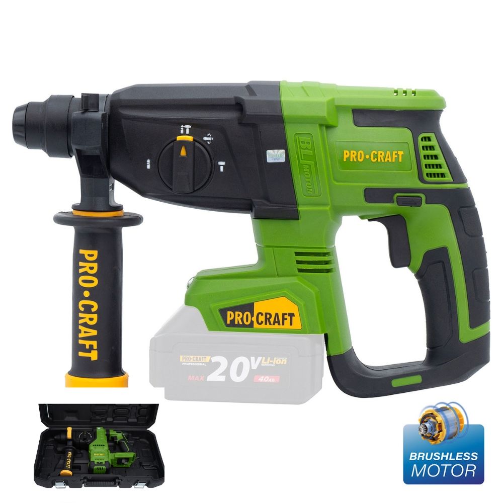 ProCraft PHA40 — продуктивний акумуляторний перфоратор з безщітковим двигуном та патроном SDSPlus. Призначений для свердління, довбання та ударного свердління в автономному режимі. Входить до лінійки 20-вольтового інструменту бренду ProCraft. Поставляється у фірмовому кейсі без акумулятора та зарядного пристрою.