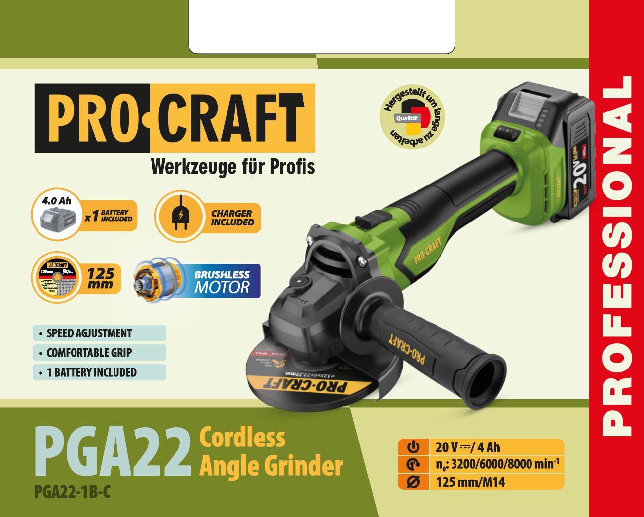 Акумуляторна болгарка Procraft PGA22 призначена для різання, шліфування та зачистки металу, каменю, цегли та інших матеріалів. Модель оснащена безщітковим двигуном, який забезпечує високу продуктивність, стабільну роботу й довговічність. Живлення від акумулятора 20 В гарантує повну мобільність без обмежень дротом, а три режими швидкості дозволяють налаштувати інструмент під різні види робіт.