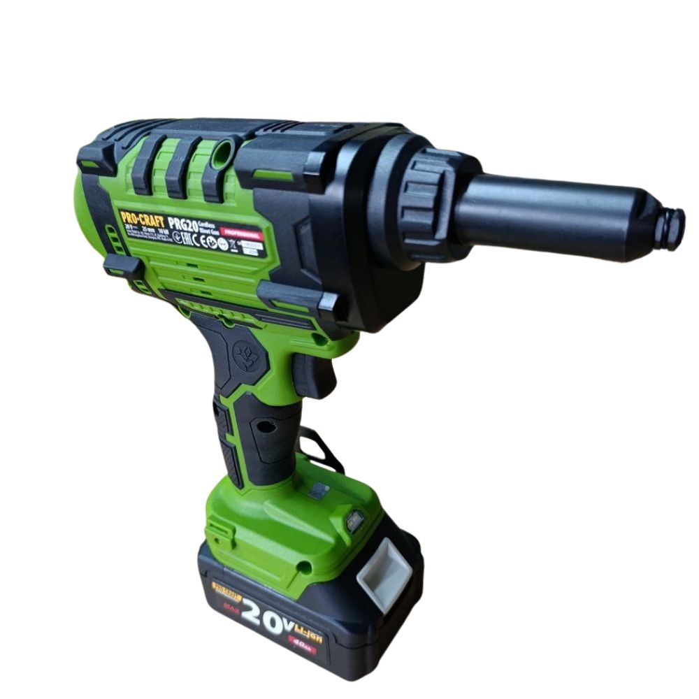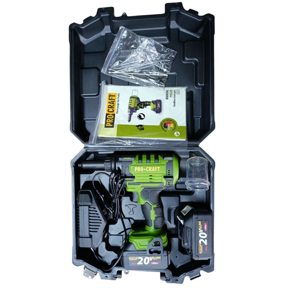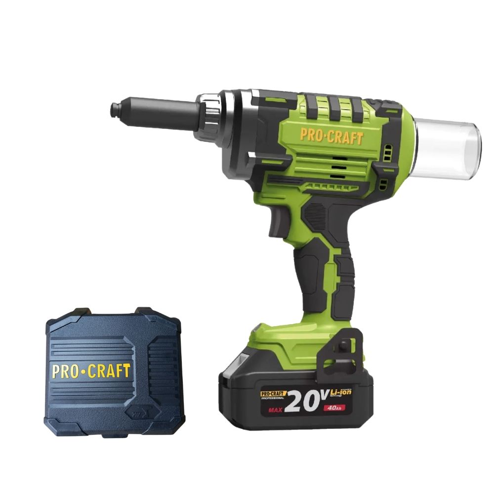 Procraft PRG20 — професійний акумуляторний заклепувальний пістолет з безщітковим двигуном, створений для монтажу алюмінієвих, сталевих і нержавіючих витяжних заклепок. Працює автономно, без дроту, дозволяє виконувати роботи швидко, чисто і з мінімальним зусиллям.