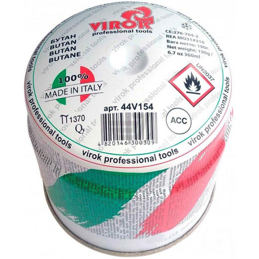 Газовий катридж ТІЛЬКИ Ф2 Балон газовий 1-разовий 'VIROK', BUTAN ,тип 200, 190 г , 360 мл (Італія) - це високоякісний газовий катридж, який ідеально підходить для використання в різних областях життя. Він оснащений з'єднанням пробивного типу, що забезпечує зручність у використанні. Балон має об'єм 360 мл і вміщує в себе 190 г газу BUTAN. Цей катридж вироблений в Італії і відрізняється високою якістю і надійністю.