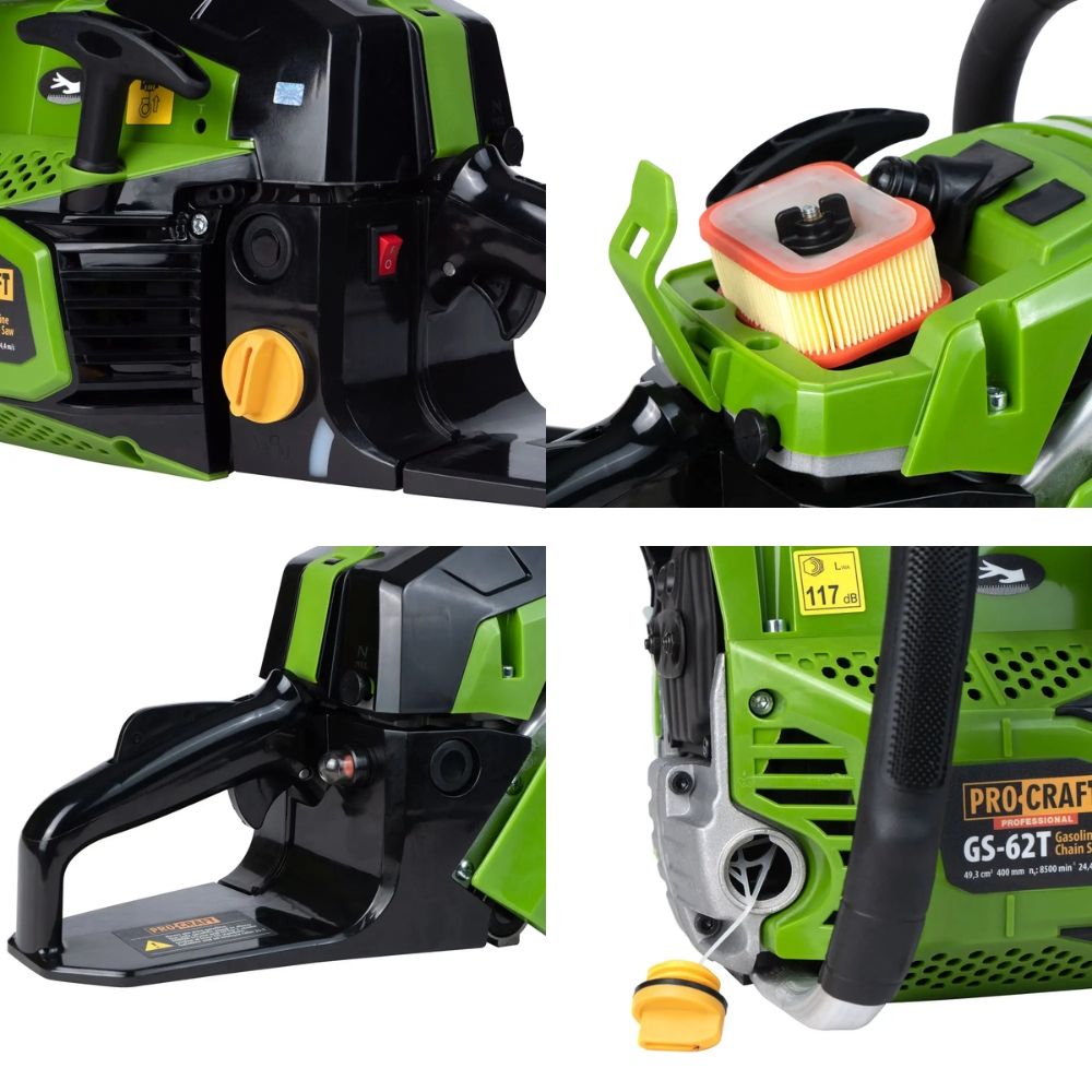 Бензопила Procraft GS-62T (2025) — потужний і надійний інструмент для заготівлі дров, обрізання дерев та будівельних робіт. Завдяки двигуну 1900 Вт і системі легкого запуску Easy Start пила швидко виходить на робочі оберти та забезпечує стабільну роботу навіть у складних умовах. Зручна конструкція та антивібраційна система гарантують комфорт під час тривалої експлуатації.