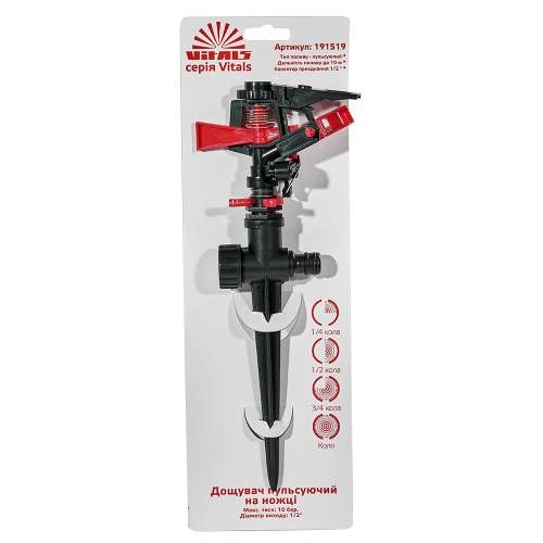 Дощувач пульсуючий на ніжці Vitals підходить для поливу невеликих і середніх площ, включаючи газони, сади, квітники та овочеві грядки. Він ідеально підходить для використання в домашніх умовах та в садових ділянках.