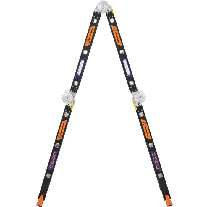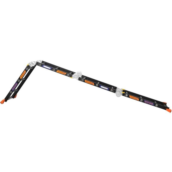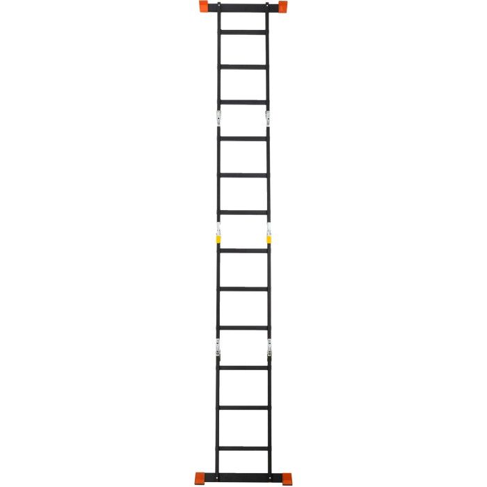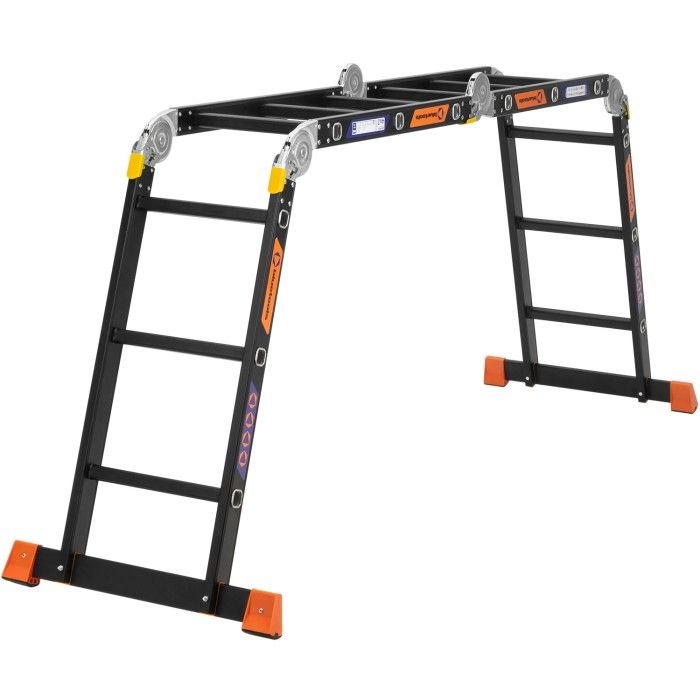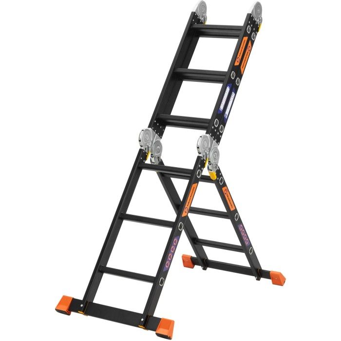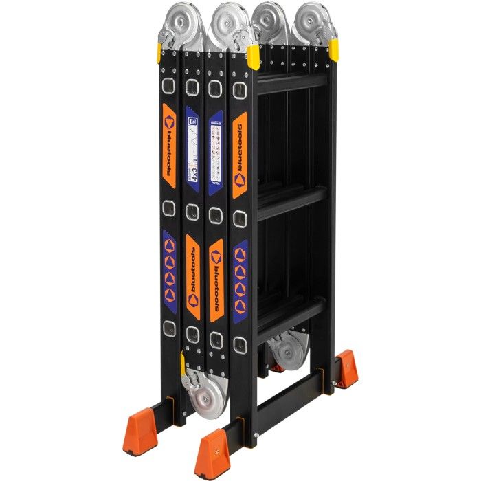 Алюмінієва драбина-трансформер BLUETOOLS BLACK із 4 секцій по 3 сходини забезпечує робочу висоту до 3,7 м. Завдяки міцній конструкції, посиленим замкам і можливості трансформації у 5 різних положень підходить для будівельних, ремонтних і садових робіт як у приміщенні, так і на вулиці.