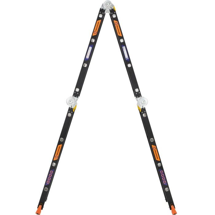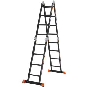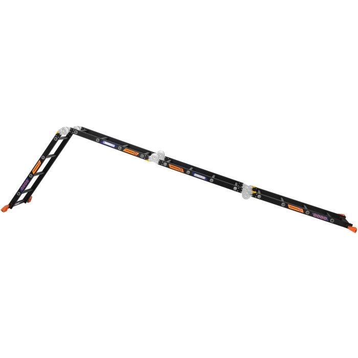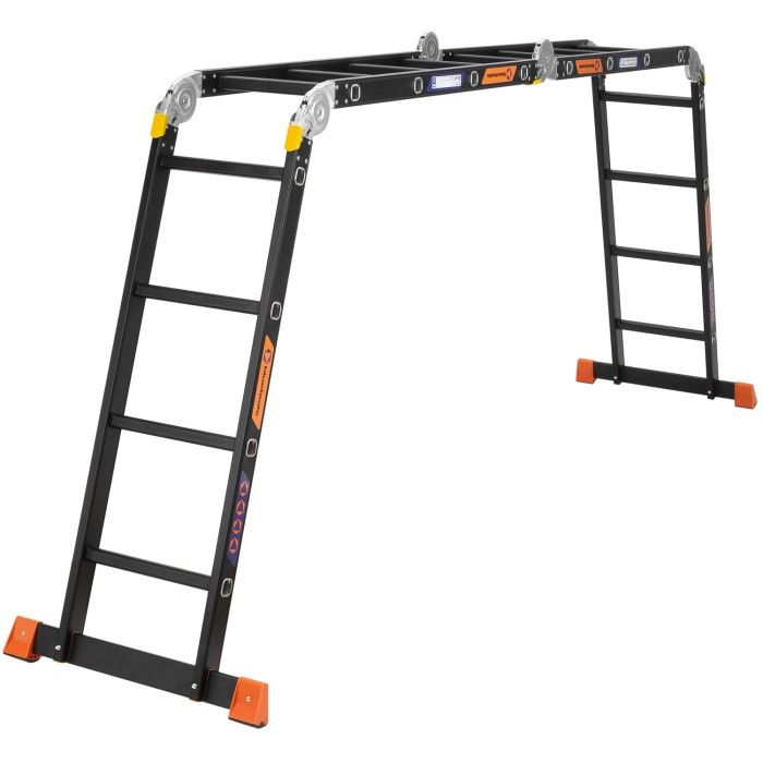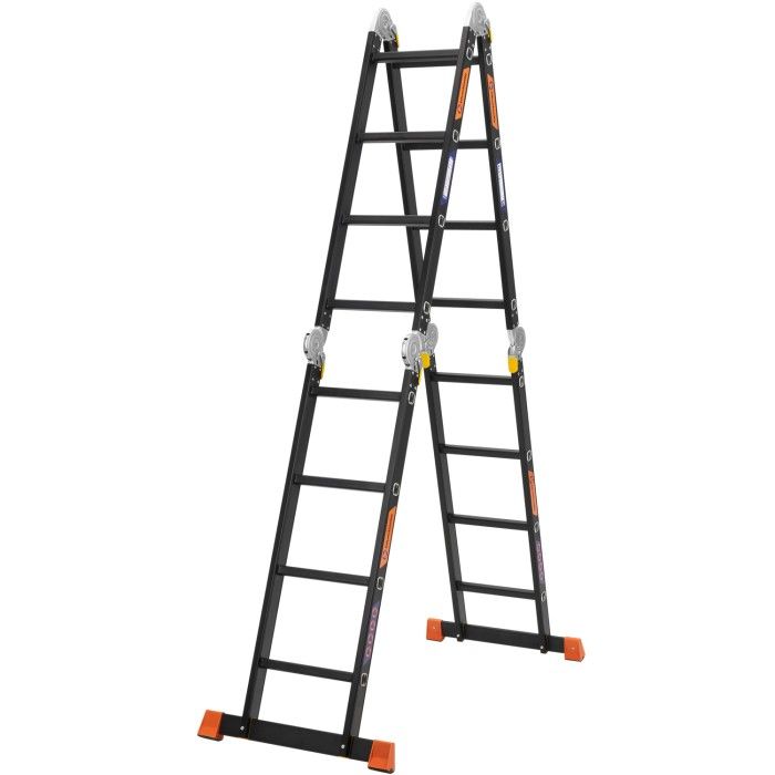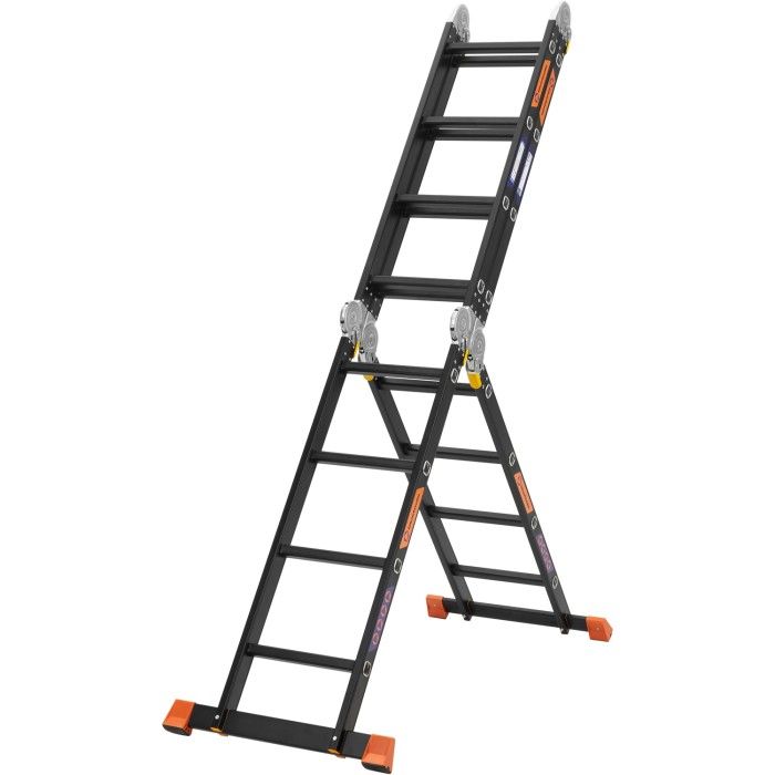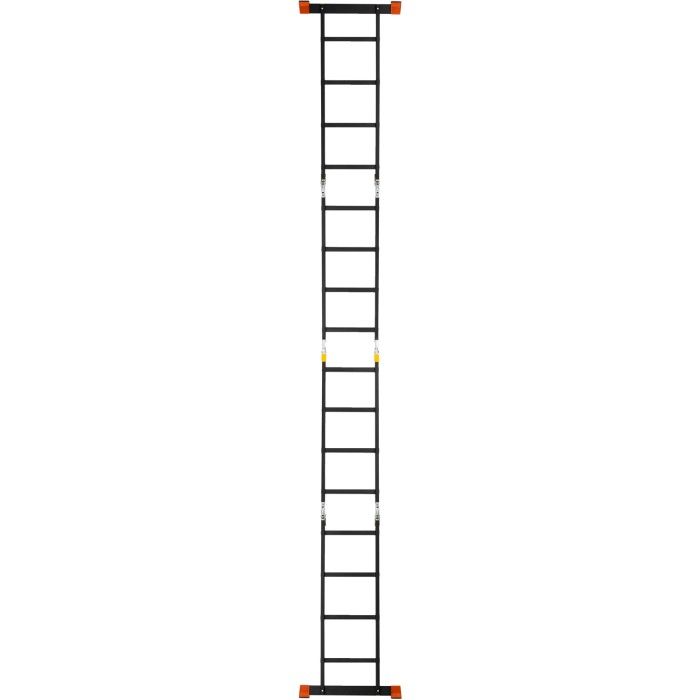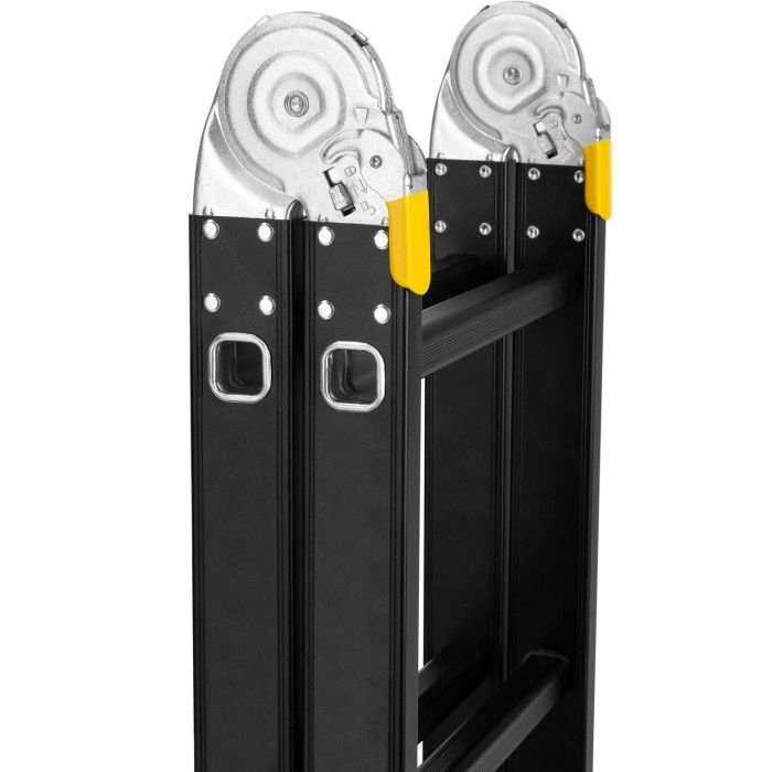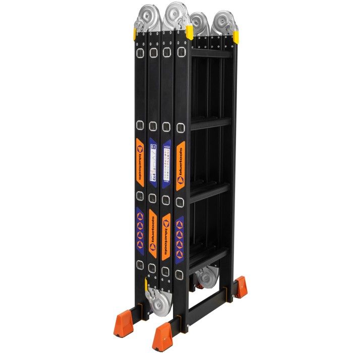 Багатофункціональна алюмінієва драбина-трансформер на 4 секції (16 сходинок), яку можна організувати як стрем’янку, приставну драбину або робочий поміст. Профіль з високоміцного алюмінію з товщиною стінки 1,51,2 мм та шириною 62 мм поєднує легкість і надійність. Нова чорна серія BLUETOOLS поєднує сучасний стиль із практичністю.