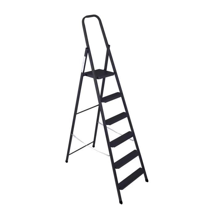 Надійна та стійка сталева драбина. Захисне епоксидне покриття робить виріб більш зносостійким. Ребриста поверхня сходинок протидіє ковзанню. Висока ручка надає додаткової зручності, дозволяючи відчувати себе безпечніше на висоті. Система складання забезпечує компактність та легкість у зберіганні.