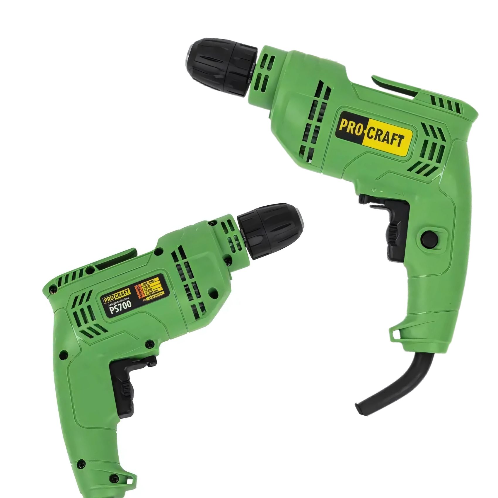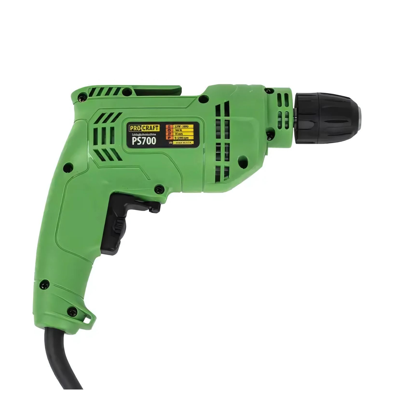 Напруга, В - 220 Частота струму, Гц - 50 Потужність, Вт - 450 Число оборотів холостого ходу, об/хв - 0-3300 Діаметр патрона, мм - 10 Діаметр свердління: дерево / бетон / метал, мм - 18/-/10 Вага, кг - 1,9 Наявність удару - Немає Дриль Procraft PS700 - це інноваційний ручний електроінструмент, який стане незамінним помічником у вашій майстерні. Серед особливостей цього безударного дрилю можна виділити: Двостороннє обертання: ця унікальна функція дозволяє використовувати дриль як мережевий шурупокрут. Ергономічний важіль знаходиться у верхній частині клавіші, забезпечуючи зручний доступ та зручне управління. Плавний пуск та регулювання обертів: широкий діапазон налаштувань дозволяє точно регулювати швидкість обертання. Коліщатко для налаштування розташоване безпосередньо на основній кнопці, що полегшує його використання. Клавіша блокування: нова функція дозволяє уникнути необережного натискання кнопки під час роботи, що забезпечує додаткову безпеку та зручність. Додаткове кріплення: дриль оснащена спеціальним кріпленням, яке дозволяє зручно підвісити її на поясі під час перерв або переміщення, зберігаючи вільні руки. Цей безударний дриль Procraft PS700 поєднує в собі передові технології та зручність використання, роблячи вашу роботу ще більш продуктивною та комфортною. Необхідний інструмент для будь-якого майстра!