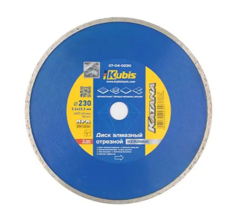Диск алмазний відрізний KERAMIK 230*22.2 мм, 2.6*5 мм, KATANA - це високоякісний диск, призначений для різання кераміки, граніту та марму. Завдяки своїй алмазній поверхні, він забезпечує швидке і безпечне різання цих матеріалів. Диск має посадковий діаметр 22.2 мм, діаметр 230 мм і тип - суцільний. Його особливості включають високу міцність, стійкість до зносу і довговічність.