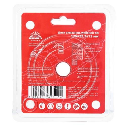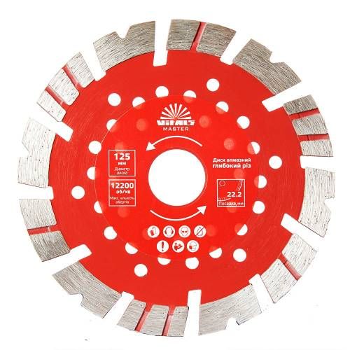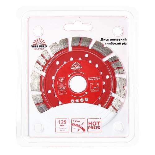 Диск алмазний Vitals Master Глибокий різ 12522,212 мм має кілька переваг: - Висока міцність і довговічність. - Глибокий різ з точністю. - Універсальність застосування. - Легкість в монтажі та знятті. Цей диск також має інші унікальні властивості, такі як здатність гасити вібрацію та захисні шари, які забезпечують безпеку при роботі.