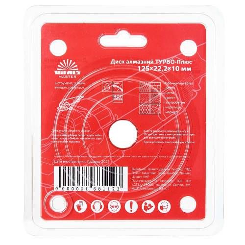 Диск алмазний Vitals Master ТУРБО-Плюс 12522,210 мм - це високоякісний інструмент, призначений для різання різних матеріалів. Завдяки своїм характеристикам, даний диск забезпечує швидке і ефективне різання бетону, цегли, граніту, залізобетону, черепиці та мрамору. Завдяки діаметру 125 мм і товщині 10 мм, диск гарно підходить для виконання різних будівельних та ремонтних робіт. Його посадковий діаметр 22,2 мм дозволяє легко монтувати диск на різних різальних машинках і інструментах.