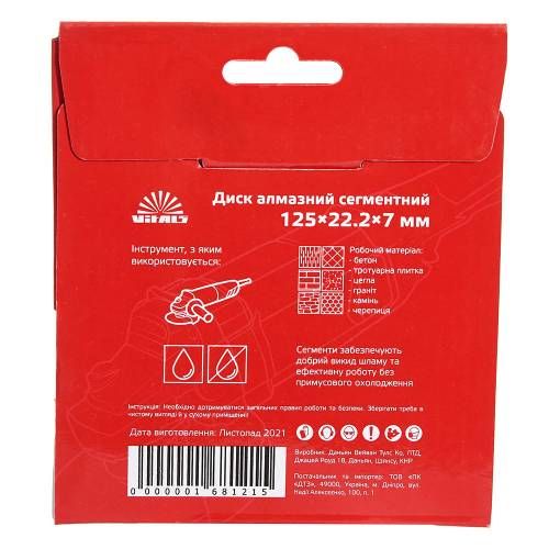 Диск алмазний сегментний Vitals 125х22.2х7 мм призначений для ефективного різання бетону, тротуарної плитки, цегли, граніту, каменю та черепиці. Може використовуватися як для сухого, так і для мокрого різання.