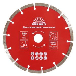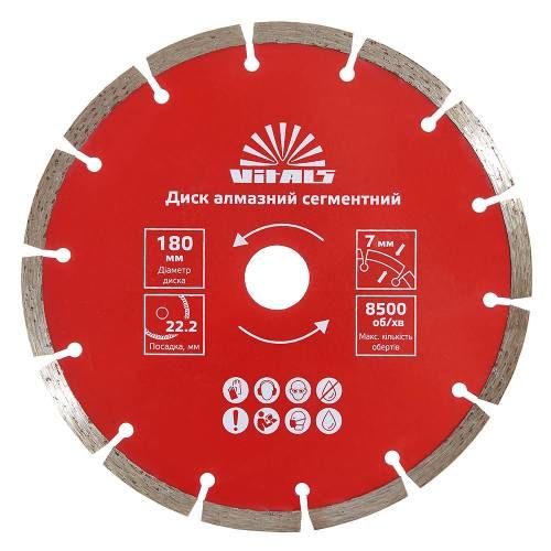 Диск алмазний Vitals сегментний 180х22.2х7 мм - високоякісний і надійний диск для різання різних матеріалів, таких як бетон, тротуарна плитка, цегла, граніт, камінь, черепиця. Завдяки своїй діаметру 180 мм і товщині 7 мм, він здатний ефективно обробляти великі поверхні. Даний диск має посадковий діаметр 22,2 мм і легко монтується на будь-який відповідний інструмент. Завдяки своїй конструкції, він забезпечує швидке і чисте різання без пошкодження матеріалу. Цей диск - оптимальний вибір для професіоналів, які займаються різанням різних поверхонь.