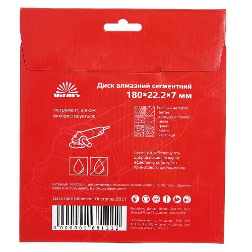 Диск алмазний Vitals сегментний 180х22.2х7 мм призначений для різання різних матеріалів, таких як бетон, тротуарна плитка, цегла, граніт, камінь, черепиця. Він ідеально підходить для будівельних робіт, реконструкцій, ремонтних робіт і використовується професіоналами в цілях створення різних конструкцій і вирізання отворів.