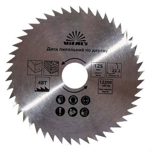 Пиляльний диск Vitals по дереву 125x22.2, T 48 підходить для поздовжнього та поперечного розпилу деревини - як м'якої, так і твердої породи, а також ДВП, ДСП.