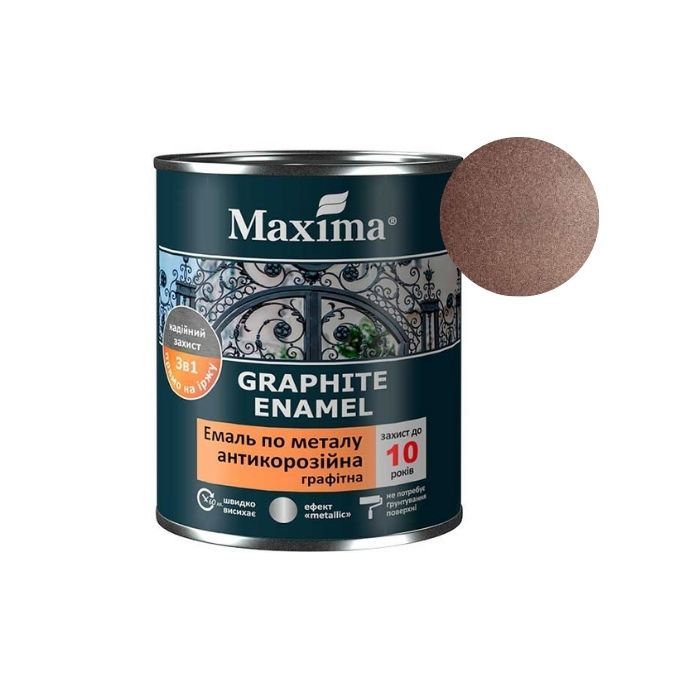 Емаль антикорозійна по металу 3в1, графітна шоколадна, ТМ «Maxima» - 0,75 л. Основа: Алкідна. матеріал поверхні: Метал / дерево. Ступінь блиску: Глянцеві. Застосування: Для зовнішніх робіт. Вид робіт: Для зовнішніх та внутрішніх робіт. Фасування, кг (л): 0,75 л. Ця емаль призначена для захисту металевих поверхонь від корозії. Вона має графітну шоколадну фарбу, що надає їй стильний вигляд. Емаль має глянцеву поверхню. Цей продукт можна використовувати як для зовнішніх, так і для внутрішніх робіт. Вона підходить для металевих та дерев'яних поверхонь. В упаковці міститься 0,75 літра емалі.