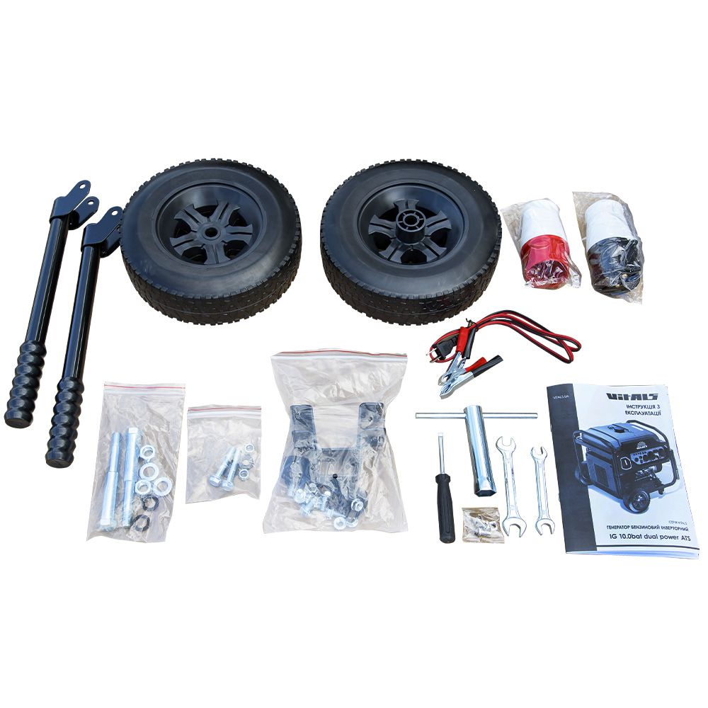 У комплект входять: генератор, блок ATS, акумулятор 12 В 12 А·год, силові дроти для зарядки, набір для транспортування (колеса і ручки), кабель підключення ATS довжиною 8 м та набір запасних елементів.