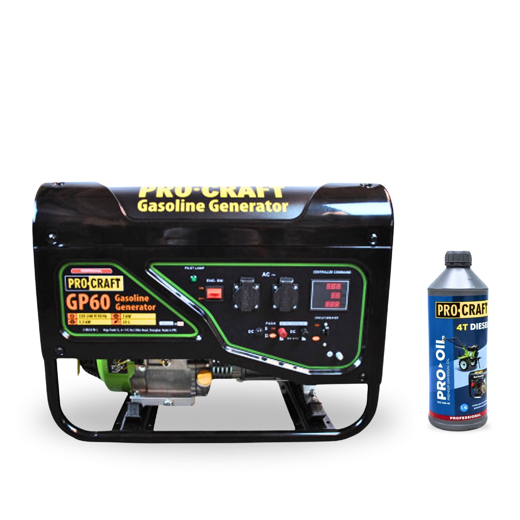 Генератор бензиновий PROCRAFT GP60 + Олива PROCRAFT 4T DIESEL 1.4л. ідеально підходить для використання на будівництві, в господарстві, на дачі, під час аварійних ситуацій, як джерело резервного живлення під час відключення електромережі та в інших сферах, де необхідно забезпечити незалежне електроживлення.