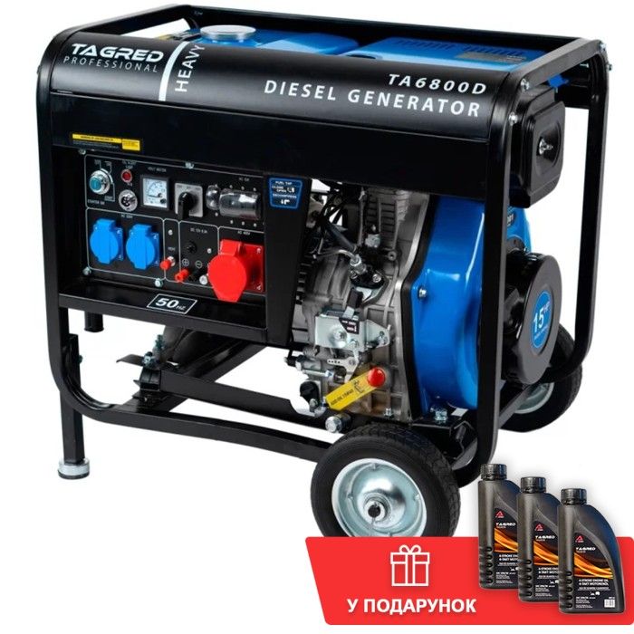 Генератор дизельний TAGRED TA6800D - це потужний агрегат з високою продуктивністю 6.8 кВт, який працює від трьох фаз і має напругу 400 В. В комплекті з генератором йде олива для змазування двигуна. Цей генератор є надійним джерелом електропостачання в умовах відсутності мережі, дозволяючи вам використовувати електроприлади без перебоїв.