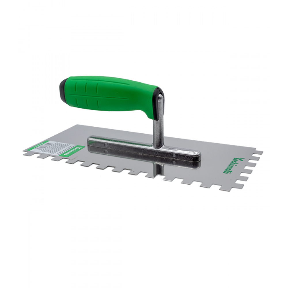 Використовується для нанесення клейових розчинів при укладанні плитки, газобетонних блоків, утепленню фасадів. В залежності від розмірів метеріалу для приклейки, підбирається розмір зуба. Має двокомпонентну ергономічну ручку. Довжина: 270мм. Розмір зуба: 6, 8, 10, 12мм.