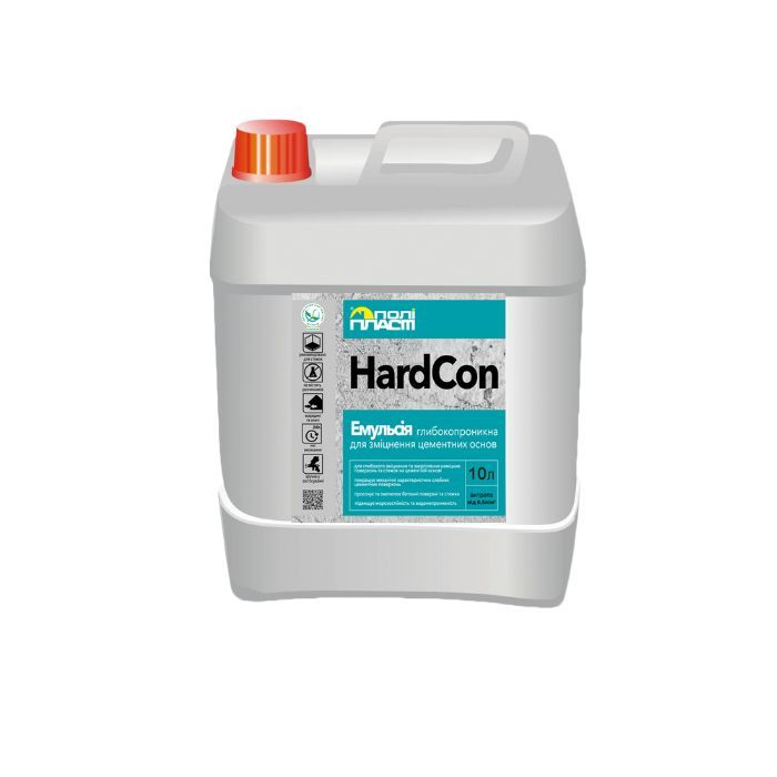 Глибокопроникна емульсія HardCon від ТМ «Поліпласт» – готова до використання суміш, яка призначена для глибокого зміцнення та закріплення цементних основ з неміцною поверхнею або зі слабкими механічними характеристиками, для закріплення цементних стяжок, штукатурок, які мають крихку поверхню внаслідок слабкої гідратації або недостатньої кількості в’яжучого.