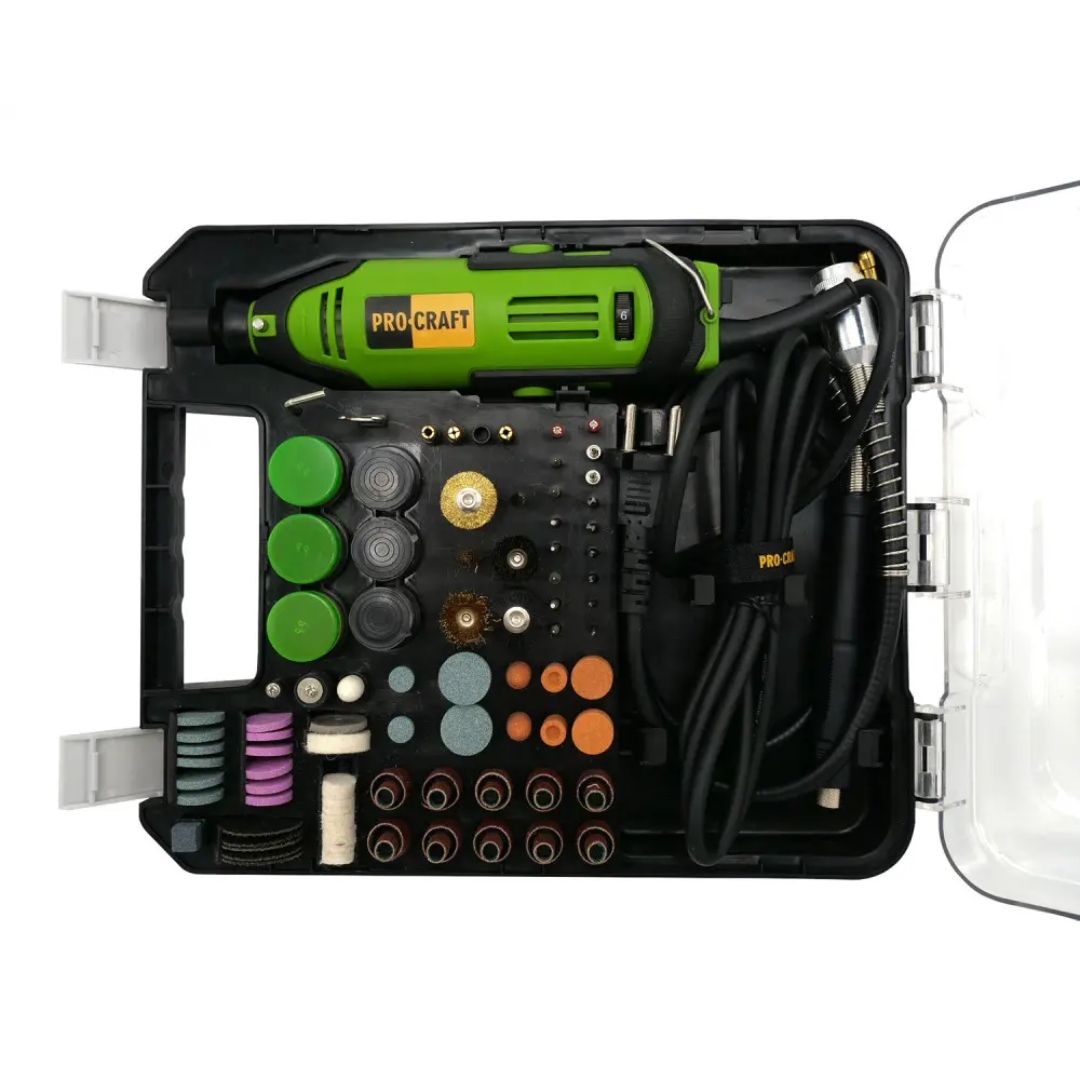 Гравер Procraft PG520 — це потужний інструмент, призначений для точної обробки матеріалів. Він працює при напрузі 220-240 В і частоті 50 Гц, споживаючи 180 Вт потужності. Гравер має регульовану швидкість обертання в діапазоні від 1000 до 32000 об/хв, що дозволяє адаптувати його до різних завдань.