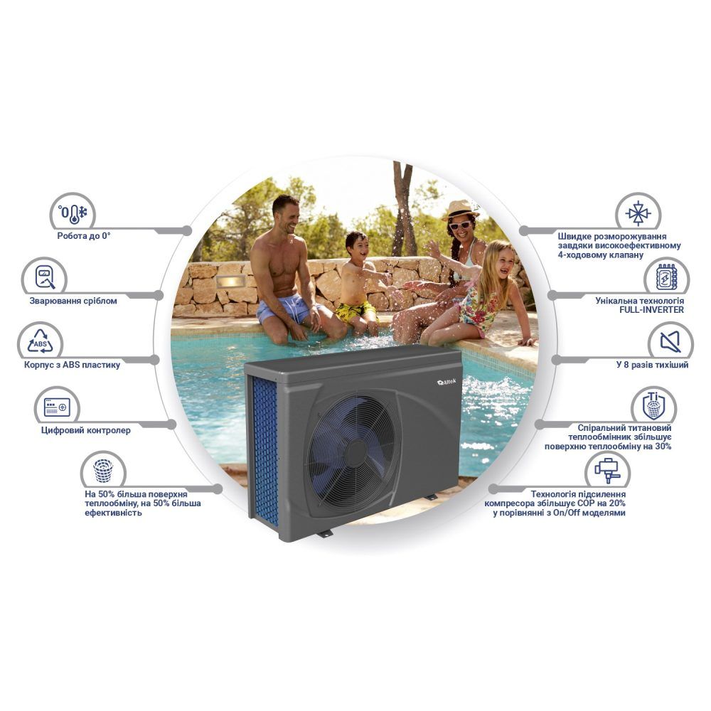 Інверторний тепловий насос для басейну Altek Pool 26 220V Інверторний тепловий насос для басейну Altec Pool потужністю 26 кВт трохи дорожче класичних теплових насосів On/Off, але більш енергоефективні, оскільки вони регулюють продуктивність (тобто кількість обертів) як компресора, так і вентилятора залежно від потреби в теплі води в басейні . Вони рідше включаються/вимикаються, тому не викликають непотрібних втрат енергії. В основному вони розраховані на роботу із середньою продуктивністю 50%, що забезпечує високий ККД, низький рівень шуму та тривалий термін служби насоса. Altec Pool – це повітряні насоси, або, точніше, теплові насоси повітря / вода для плавальних басейнів, що використовують атмосферне повітря як нижнє джерело (від якого виходить тепло). Ці насоси є «моноблочними», тобто компактними насосами, які містять всі компоненти в одному корпусі. Завдяки цьому установка насосів дуже проста, а додаткові інвестиційні витрати включають придбання труб ПВХ, фітингів та клапанів діаметром d50/63 мм та підключення пристрою до системи фільтрації басейну. Низький гідравлічний опір у конденсаторі, тобто в титановому теплообміннику, в якому нагрівається вода в басейні, дозволяє використовувати існуючий фільтруючий насос для басейну. Низький рівень шуму (інтенсивність звуку). У насосах Altec Pool використовуються малошумні компресори GMCC та вентилятори з регульованою швидкістю. Робота пристрою за підтримки заданої температури води з ККД 50% приблизно в 7 разів тихіше, ніж у класичних теплових насосів On/Off. Тепловий насос для басейну Altec Pool Характеристики теплових насосів Altek Pool: Низькі експлуатаційні витрати в порівнянні з іншими джерелами тепла, такими як газові або олійні котли або електричні нагрівачі. Високий коефіцієнт корисної дії COP Титановий теплообмінник та покриття з ПВХ для збільшення терміну служби на 50% та підвищення ефективності на 50%. Використання екологічного холодоагенту R32. Вбудований цифровий контролер із дуже простим керуванням. Ефективне розморожування гарячим газом за допомогою 4-ходового клапана японської компанії Saginomiya. Корозійно-стійкий корпус із АБС-пластику. Простота встановлення та експлуатації. Тиха робота. Можливість роботи при температурі повітря від -5°С.