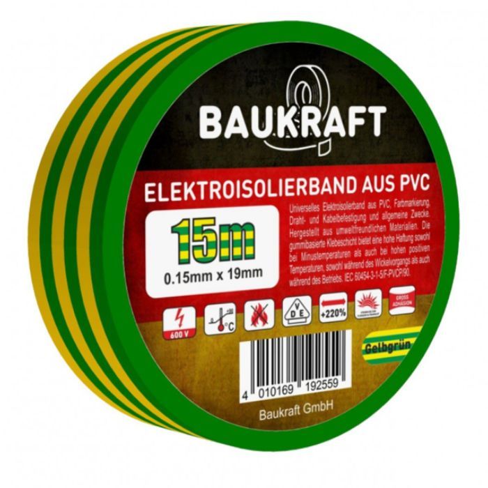 Ізоляційна стрічка ПВХ TM BAUKRAFT, 0,15 мм 19 мм 15 м, жовто-зелена (21 шт у пакеті), Germany