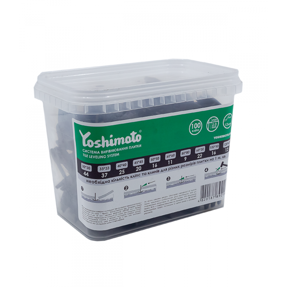 Виготовлені з міцного пластику, кліпси витримують необхідне зусилля затискання та не деформуються в процесі роботи. Підходять для використання з плиткою різної товщини. Застосовуються разом із клинами та спеціальними кліщами для якісної та швидкої укладки керамічної плитки на підлогу чи стіни.