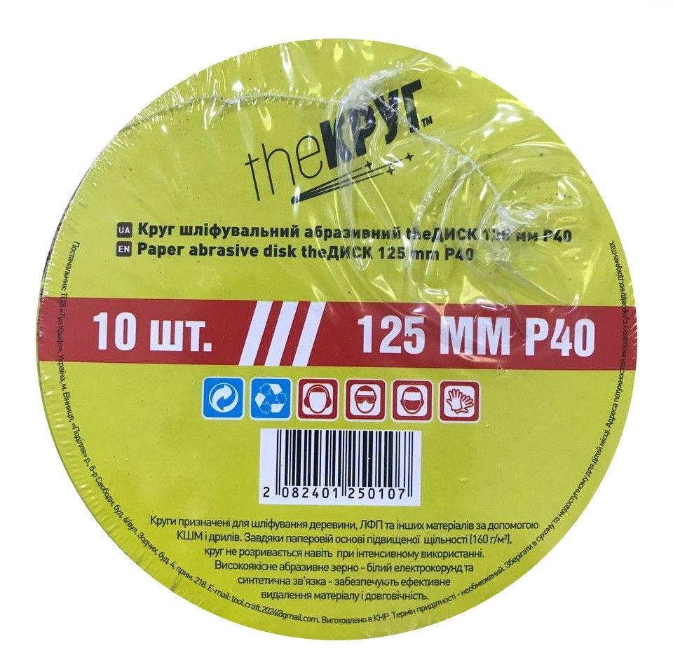 Коло абразивне діаметром 125 мм, №40 використовується як насадка для шліфувальних машин. Застосовується при сухій обробці матеріалів з деревини, металу, пластмаси, для зняття лакофарбових поверхонь, іржі, для вирівнювання поверхонь. Висока стійкість абразиву до зношування, еластична основа.