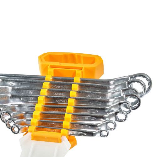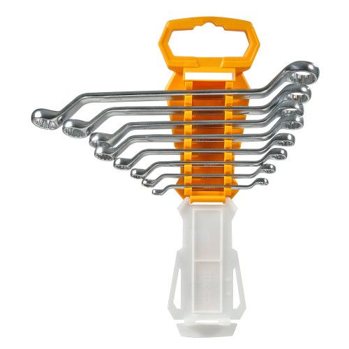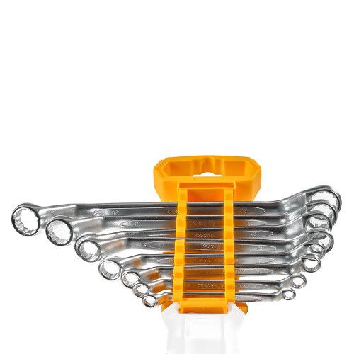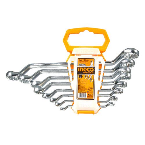 Комплект накидних вигнутих гайкових ключів 6–22 мм INGCO INDUSTRIAL - це набір професійних інструментів, які допоможуть вам з легкістю виконати будь-які роботи зі знімання та закріплення гайок і болтів. Завдяки вигнутої формі, ці ключі легко проходять навіть у вузьких місцях і перекручуються під правим кутом до осі головки гайки або болта, що дозволяє швидко і точно відкручувати та закручувати елементи з'єднання. Комплект включає в себе гайкові ключі різної величини - від 6 до 22 мм, що дозволяє використовувати їх для різних розмірів гайок і болтів. Цей набір є ідеальним вибором для будь-якого професіонала або любителя, який працює в галузі побутового ремонту, авто- та майстерських робіт.