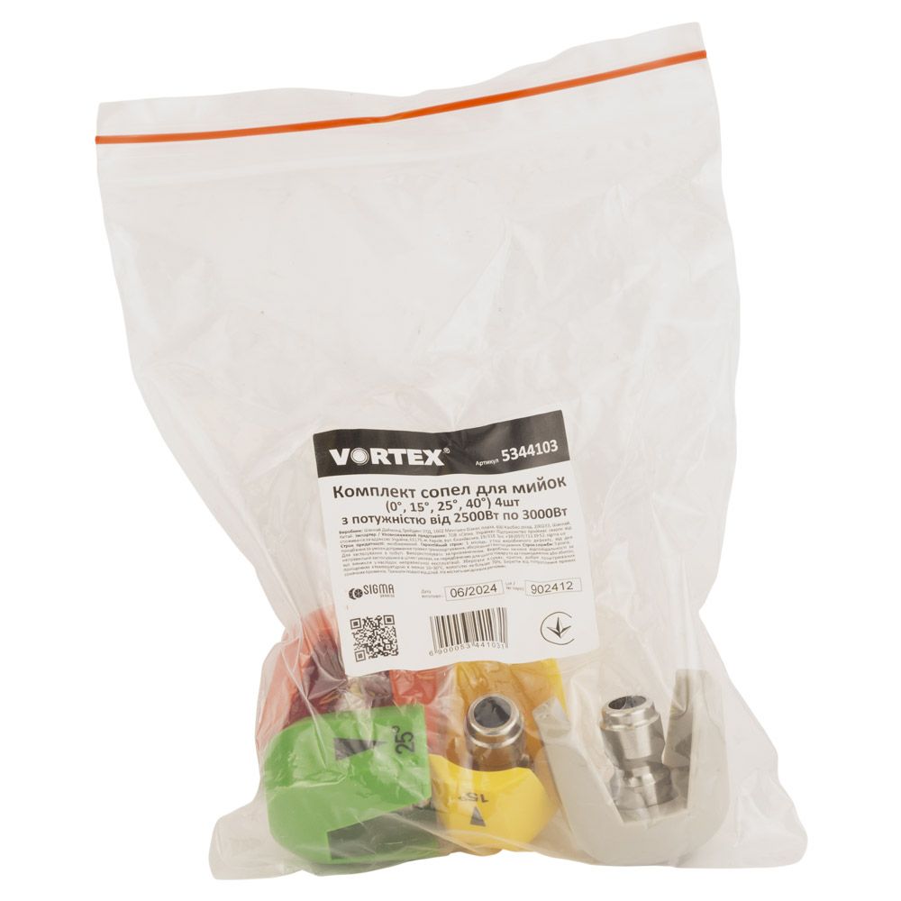 Комплект сопел (0°, 15°, 25°, 40°) 4шт для мийок високого тиску з потужністю від 2500Вт до 3000Вт SIGMA (5344103)