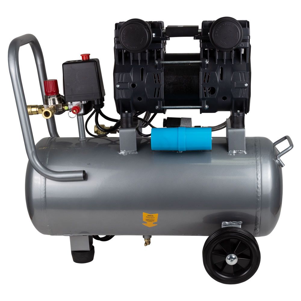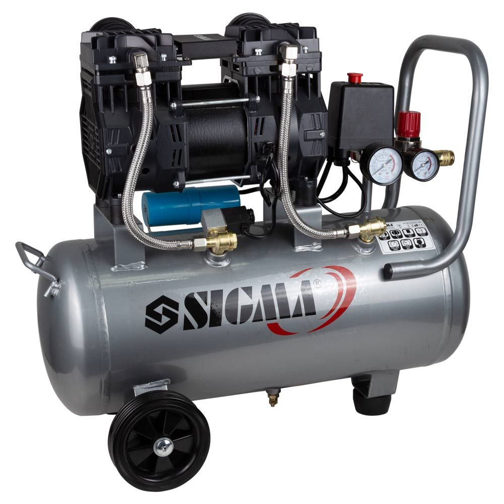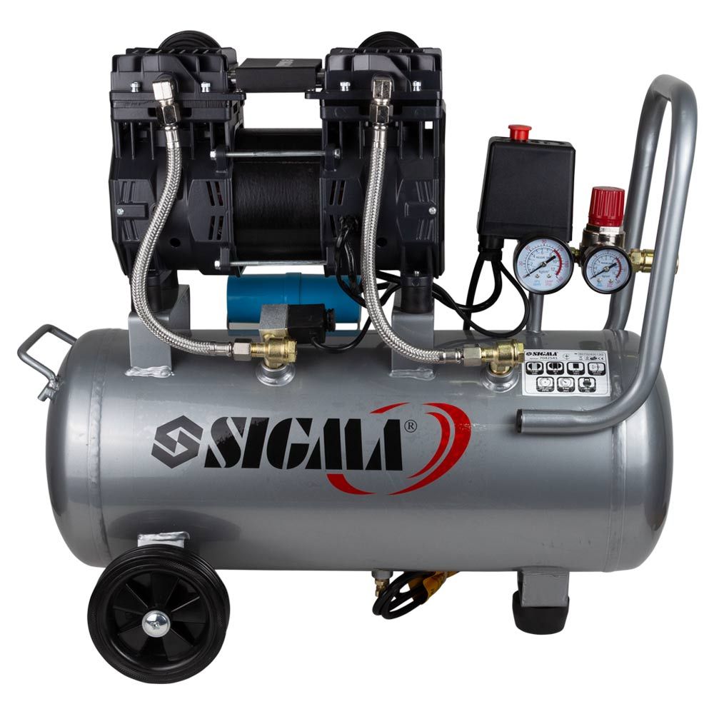 Компресор двоциліндровий безмасляний 1.5кВт 209л/хв 8бар 30л SIGMA (7042541) призначений для нагнітання стисненого повітря з подальшою його подачею під тиском в різні типи пневмоінструменту. Дана модель компресора працює без масла, тому не вимагає техобслуговування по контролю і доливці масла. Відрізняється чистим повітрям, який не містить будь-яких домішок. Колеса забезпечують стійке положення на поверхні, а гумова подушечка знижує рівень вібрації.