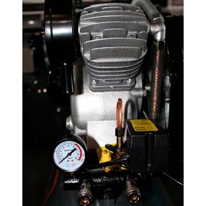 Компресор зручний у використанні завдяки системі автоматики, двом швидкознімним виходам, точним манометрам і регулятору тиску. Для безпеки передбачено клапан аварійного скидання, захист двигуна за стандартом IP54 і міцна металева решітка на ремінному приводі. Колеса та ергономічна ручка роблять транспортування легким і зручним.