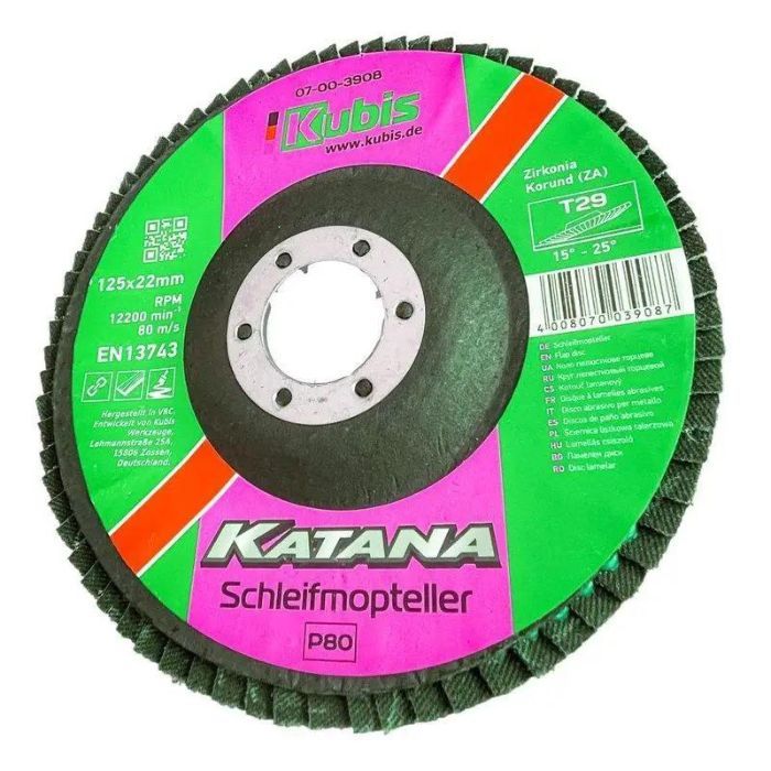 Круг пелюстковий торцовий конічний Т29 Р80, 125*22 мм, Zirconia KATANA використовується для обробки різноманітних матеріалів, таких як сталь, лак, пластик, метал, дерево і фарба. Він ідеально підходить для ремонту автомобілів, обробки металевих деталей, а також для різних робіт з деревиною. Цей круг надає можливість швидко та якісно виконувати різні завдання.
