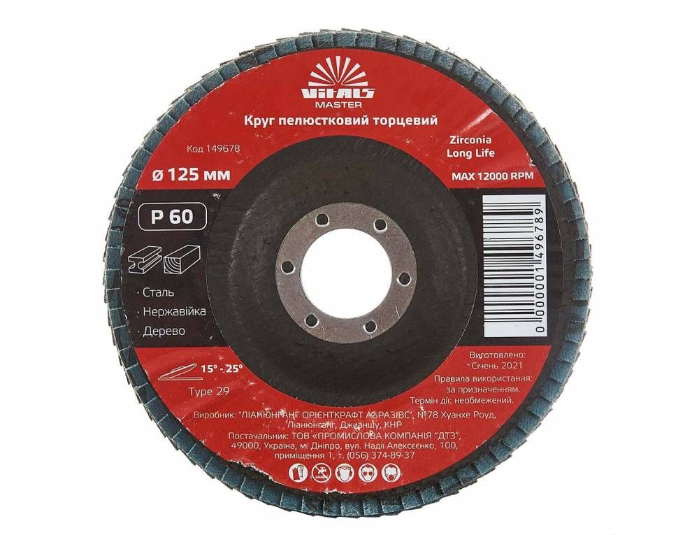 Круг пелюстковий торцевий Vitals Master Zirconia 125x22.2мм з.60 ідеально підходить для шліфування і полірування різних поверхонь, таких як метал, кераміка, скло і пластик. Використовується в промислових, будівельних, ремонтних та декоративних роботах.