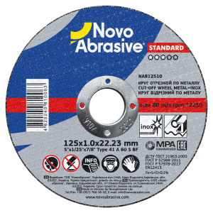 Круг відрізний для металу та нержавіючої сталі NovoAbrasive STANDARD 41 14А 125 1,0 22,23 - це високоякісний і надійний інструмент, призначений для різання металевих та нержавіючих матеріалів. Він має посадковий діаметр 22.2, суцільний тип, і розмір диска 125 мм з товщиною 1 мм. Цей круг відрізний є ідеальним вибором для різання металу з високою точністю і швидкістю. Він має велику міцність і довговічність, що дозволяє йому легко впоратися з будь-якими завданнями різання. Завдяки своїм унікальним характеристикам, цей круг забезпечить вам чудові результати при роботі з металевими матеріалами.