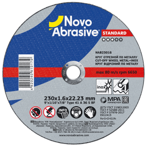 Круг відрізний для металу та нержавіючої сталі NovoAbrasive STANDARD 41 14А 230 1,6 22,23 - це високоякісний і надійний інструмент, який призначений для різання металу та нержавіючої сталі. Він має посадковий діаметр 22.23 мм і зроблений з суцільного матеріалу. Діаметр диска складає 230 мм, товщина - 1,6 мм. Цей круг забезпечує швидке та точне різання металу без появи пошкоджень та відсічень. Він дуже зручний у використанні і гарантує високу продуктивність. Відрізний круг NovoAbrasive STANDARD 41 14А 230 1,6 22,23 - ідеальний інструмент для професійних робітників та домашнього використання.