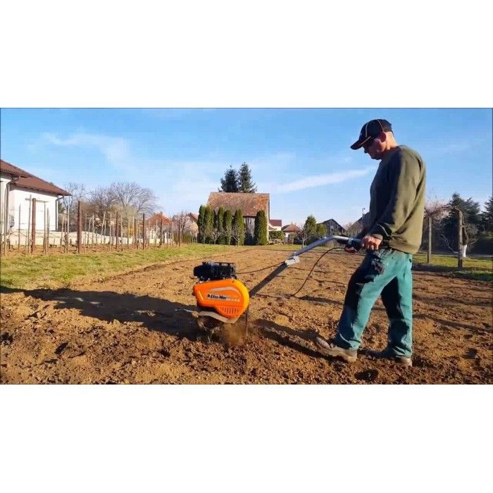 Завдяки фрезам із регульованою шириною культивації (22–46 см) ви зможете обрати оптимальний режим роботи. Механічна коробка з 1 передачею вперед, зручне кермо з 3 положеннями та транспортувальне коліщатко забезпечують легкість у керуванні та маневреність.