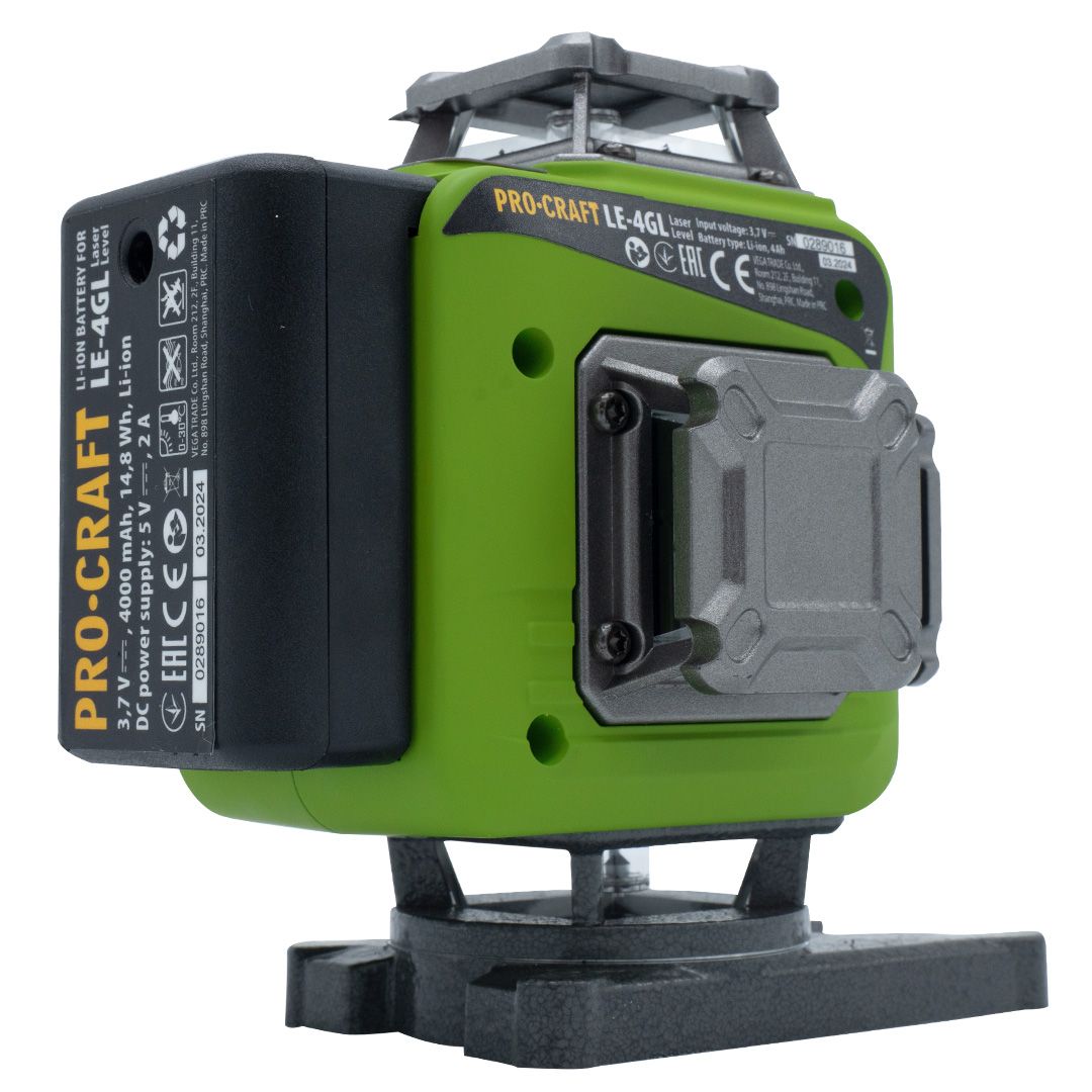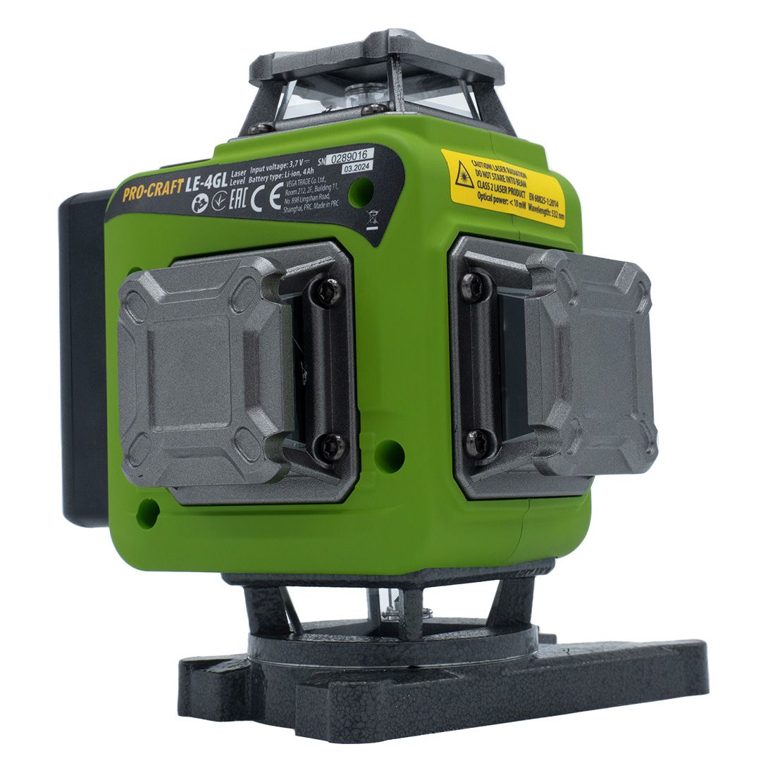 Лазерний рівень Procraft LE-4GL призначений для побудови горизонтальних та вертикальних площин, використовується при вирівнюванні поверхонь, установці дверей та вікон, розмітці конструкцій, будівництві стін та інших роботах. Прилад обладнано функцією самовирівнювання. При досягненні кута нахилу, що перевищує діапазон вирівнювання, промінь починає блимати та звучить характерний сигнал. Попереднє налаштування точності установки здійснюється за допомогою бульбашкового рівня. Поворотна основа з поділами уможливлює вертикальне наведення променя в потрібну сторону. Просте та легке управління. Функція самовирівнювання. Висока точність виміру. При відхиленні приладу від горизонтальної лінії спрацьовує сигнал, що унеможливлює помилкову розмітку. Клас лазера 2 для безпечної експлуатації