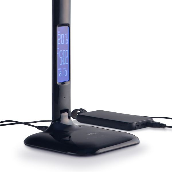 Конструкція дозволяє складати лампу навпіл, економить робоче місце днем і зручна для експлуатації та транспортування. За допомогою рухомого кріплення ви легко зможете змінити кут освітлення. Кут розсіювання світла у даній настільній лампі складає 120°. LCD дисплей показує годинник, будильник, календар, термометр. Підсвічування ЖК дисплея в разі потреби можна вимкнути. Дисплей можна налаштувати за допомогою кнопок, які знаходяться на зворотному боці корпусу настільної лампи.