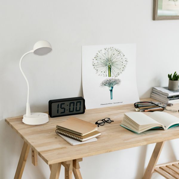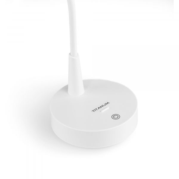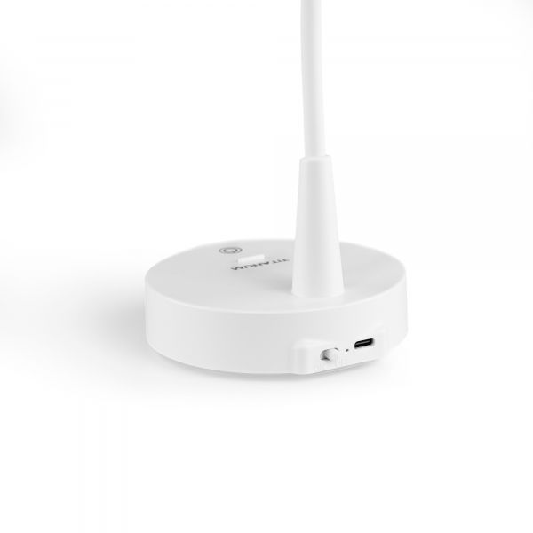 LED лампа настiльна з акумулятором TITANUM TLTF-012W 7W 3000-6000K – стильна та компактна лампа з можливістю регулювання яскравості та колірності. Лампа абсолютно безшумна, має в комплекті акумулятор та тривалий термін служби. Корпус виготовлений з екологічно безпечного якісного пластику білого кольору. Рухома конструкція ніжки лампи дозволяє скеровувати світло у потрібному напрямку. Розрахована для освітлення письмового чи робочого столу. Реалізована можливість регулювання яскравості та зміни колірності світла, що сприяє зменшенню навантаження на зір. Керування лампою здійснюється за допомогою сенсорної кнопки, розташованої на її корпусі. Додатково лампа слугує також в якості підставки для смартфона. Для цього на корпусі є спеціально відведене місце з бортиком.