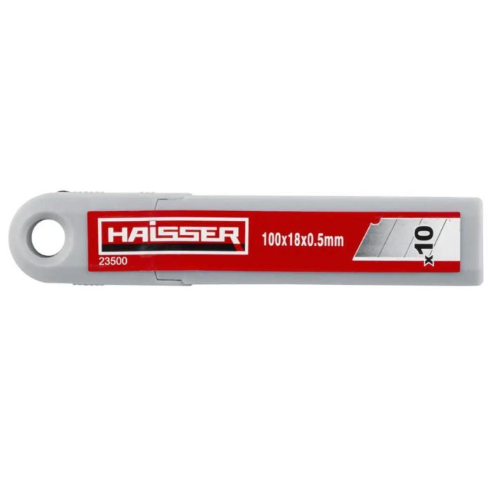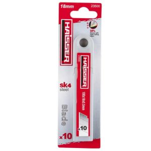 Сегментовані леза HAISSER (18х100 мм, 10 шт) призначені для швидкої заміни основного леза ножа, що втратило свою гостроту. Вони підходять для розрізання щільного паперу, плівки, картону та лінолеуму. Ріжуча кромка виготовлена з високоякісної сталі SK4 з тригранним ультратонким заточенням, що забезпечує точність і ефективність різання. На лезах є насічки, що дозволяють легко видалити затуплені ділянки. Товщина кожного леза становить 0,5 мм, а в упаковці міститься 10 штук, що робить їх зручними для регулярного використання.