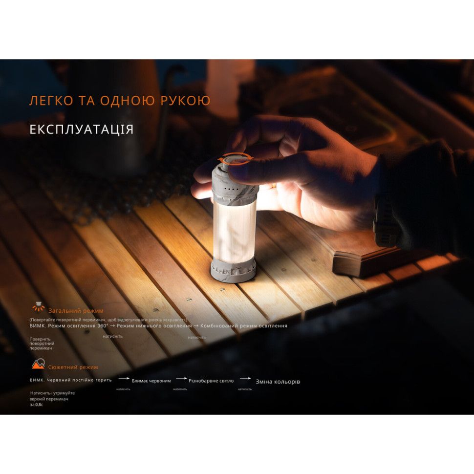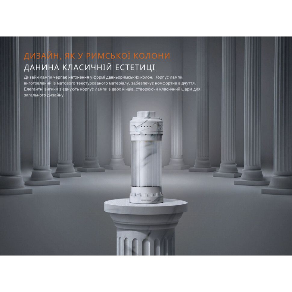 Кемпінговий ліхтар Fenix CL22R білого кольору призначений для освітлення наметів, кемпінгів, альтанок і приміщень під час відпочинку на природі або аварійних ситуацій. Забезпечує рівномірне кругове освітлення, зручне керування режимами та можливість автономної роботи від вбудованого акумулятора.