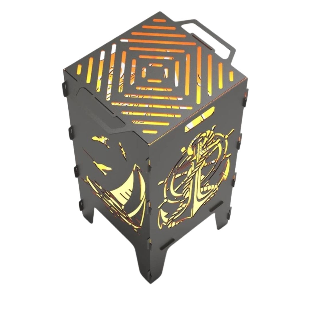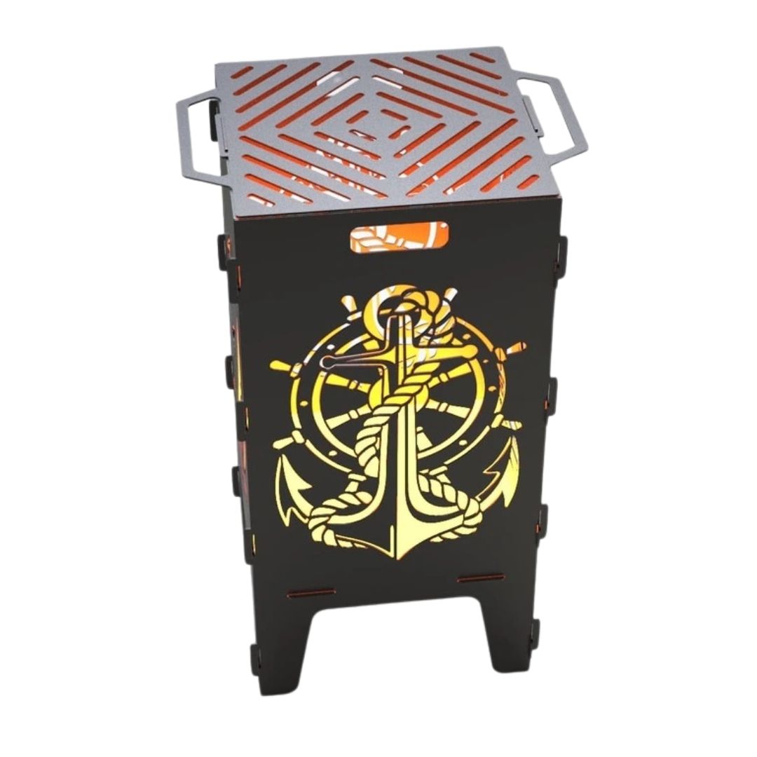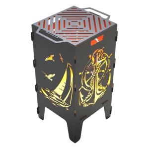 Мангал-барбекю Carino Якір і Вітрильник — розбірна модель з морським дизайном, що поєднує функціональність і декоративний вигляд. Вирізи у вигляді якоря та вітрильника створюють виразний світловий ефект під час горіння і додають атмосферності зоні відпочинку. Метал товщиною 3 мм забезпечує надійність і тривалий термін служби.
