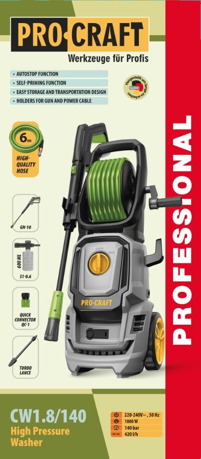 Мийка високого тиску Procraft CW1.8/140 призначена для очищення автомобілів, інструменту, фасадів та інших поверхонь. Оснащена щітковим двигуном, забезпечує стабільний тиск і ефективне видалення забруднень у побутових умовах.