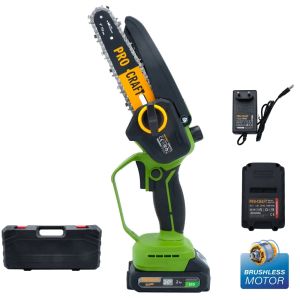 Акумуляторна міні-пила Procraft PKA45 призначена для швидкого та точного розпилювання деревини, гілок і дощок. Оснащена безщітковим двигуном, що забезпечує високу продуктивність і довговічність роботи. Модель комплектується двома акумуляторами та зарядним пристроєм, а також ланцюговою оливою 200 мл для догляду за інструментом.