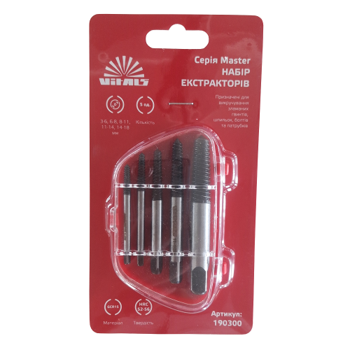 Набір екстракторів 5 од. Vitals Master може бути використаний в різних сферах, таких як автомобільний ремонт, ремонт техніки, будівництво, меблеве виробництво та багато інших. Він допоможе вам зручно та швидко витягнути різні компоненти або деталі зі складних механізмів.